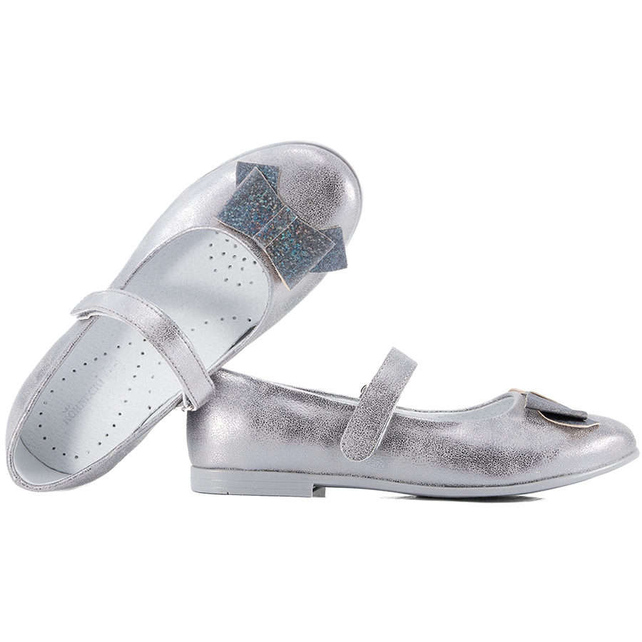 Balerínky, barva stříbřitě šedá, aplikace mašličky, zapínání na jeden suchý zip přes nárt, svrchní materiál syntetika, uvnitř kožené-stélka s podporou klenby.