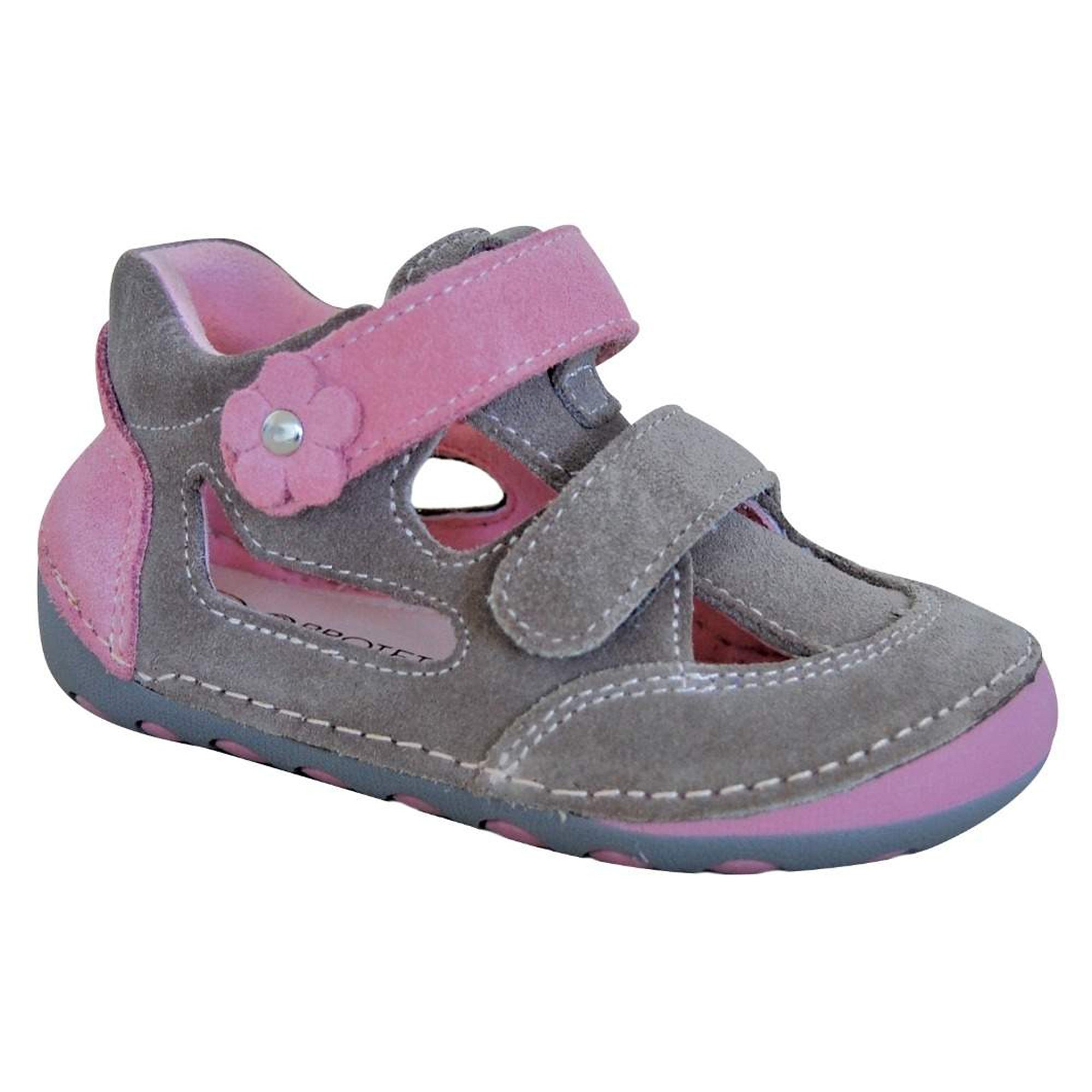 Kožené barefoot sandálky, barva šedá v kombinaci s růžovou, aplikace kytičky, svrchní materiál kůže, uvnitř textil, kožená vytahovací stélka, zapínání na dva suché zipy, ohebná podrážka.Stélka: 19-130 mm, 20-135 mm, 21-140 mm, 22-145 mm, 23-155 mm, 24-160 mm, 25-170 mm, 26-175 mm celý popis