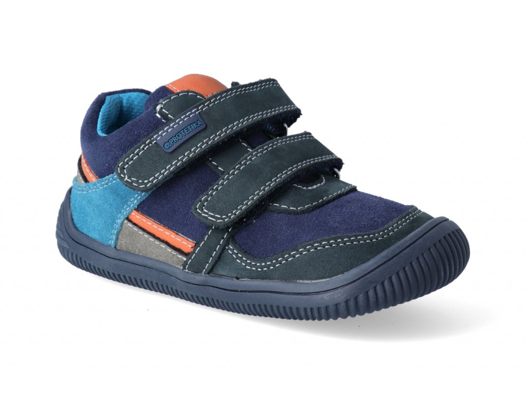 Celoroční BAREFOOT boty, barva tmavě šedá v kombinaci s tmavě šedou, oranžovou, hnědou a tyrkysovou, svrchní materiál kůže, uvnitř textil, zapínání na dva suché zipy, kožená vytahovací stélka.
