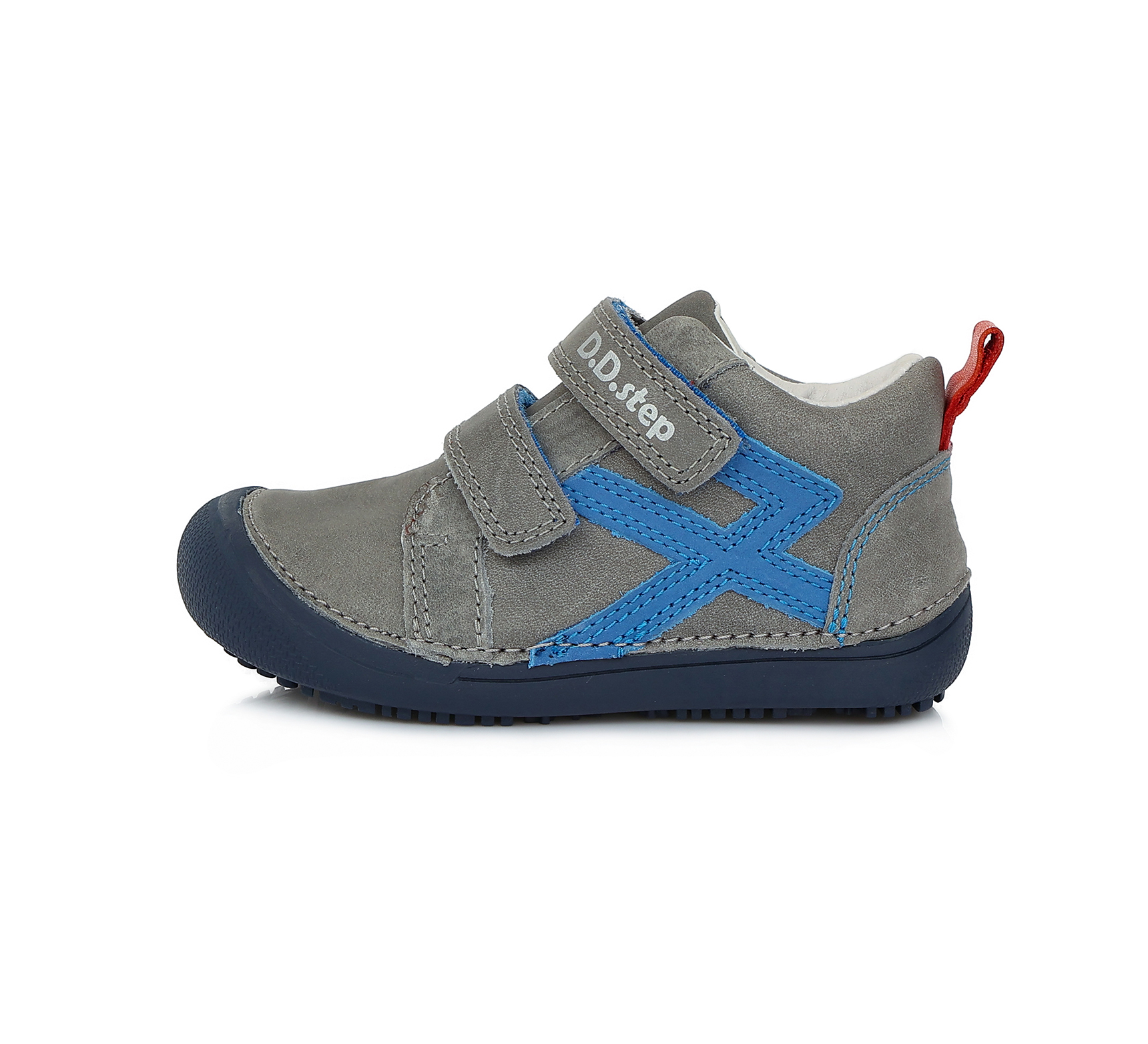 Celokožené BAREFOOT boty, zapínání na dva suché zipy, barva šedá v kombinaci s modrou a červenou, vytahovací stélka, reflexní prvky. Špice chráněna proti okopu.