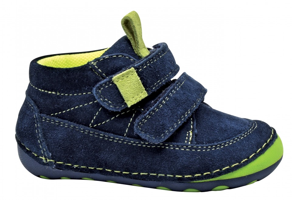 Celoroční BAREFOOT boty, barva tmavě modrá v kombinaci se zelenou, svrchní materiál kůže, uvnitř textil, zapínání na dva suché zipy, kožená vytahovací stélka.