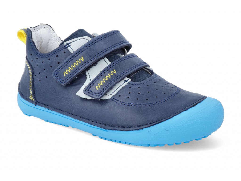 Celokožené BAREFOOT boty, zapínání na dva suché zipy, barva modrá v kombinaci s béžovou a žlutou, vytahovací stélka, reflexní prvky. Špice chráněna proti okopu.