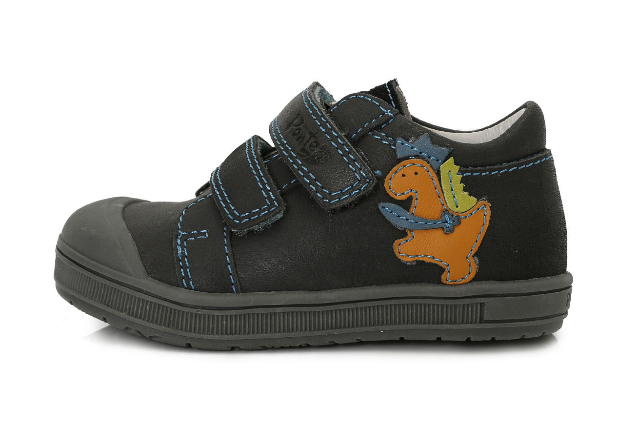Celokožené boty na dva suché zipy, barva černá v kombinaci s oranžovou, modrou a zelenou, aplikace dráčka, ohebná podrážka, kožená vytahovací stélka, pevná pata. Špice chráněna proti okopu.
