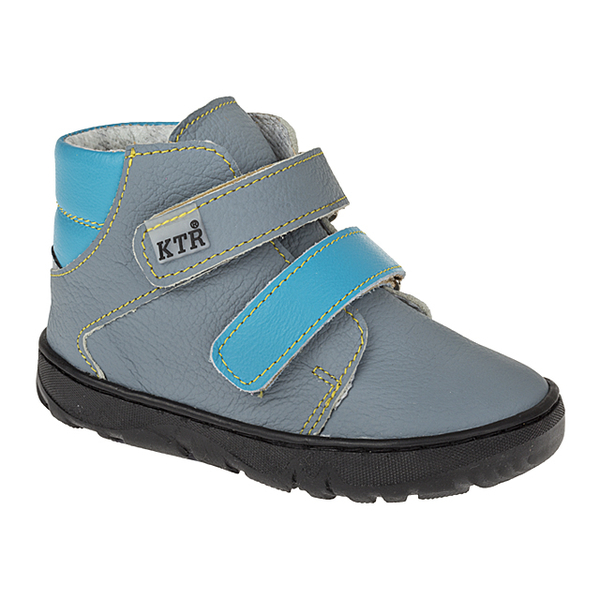 Celoroční boty, barva šedá v kombinaci s tyrkysovou, svrchní materiál kůže, uvnitř textil, zapínání na dva suché zipy, vyjímatelná stélka. Pevná pata, reflexní prvky.