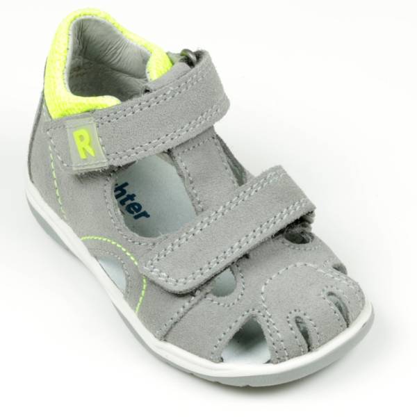 Letní celokožené sandálky, barva šedá v kombinaci s reflexní zelenou, zapínání na dva suché zipy, ohebná podrážka, pevná pata.
