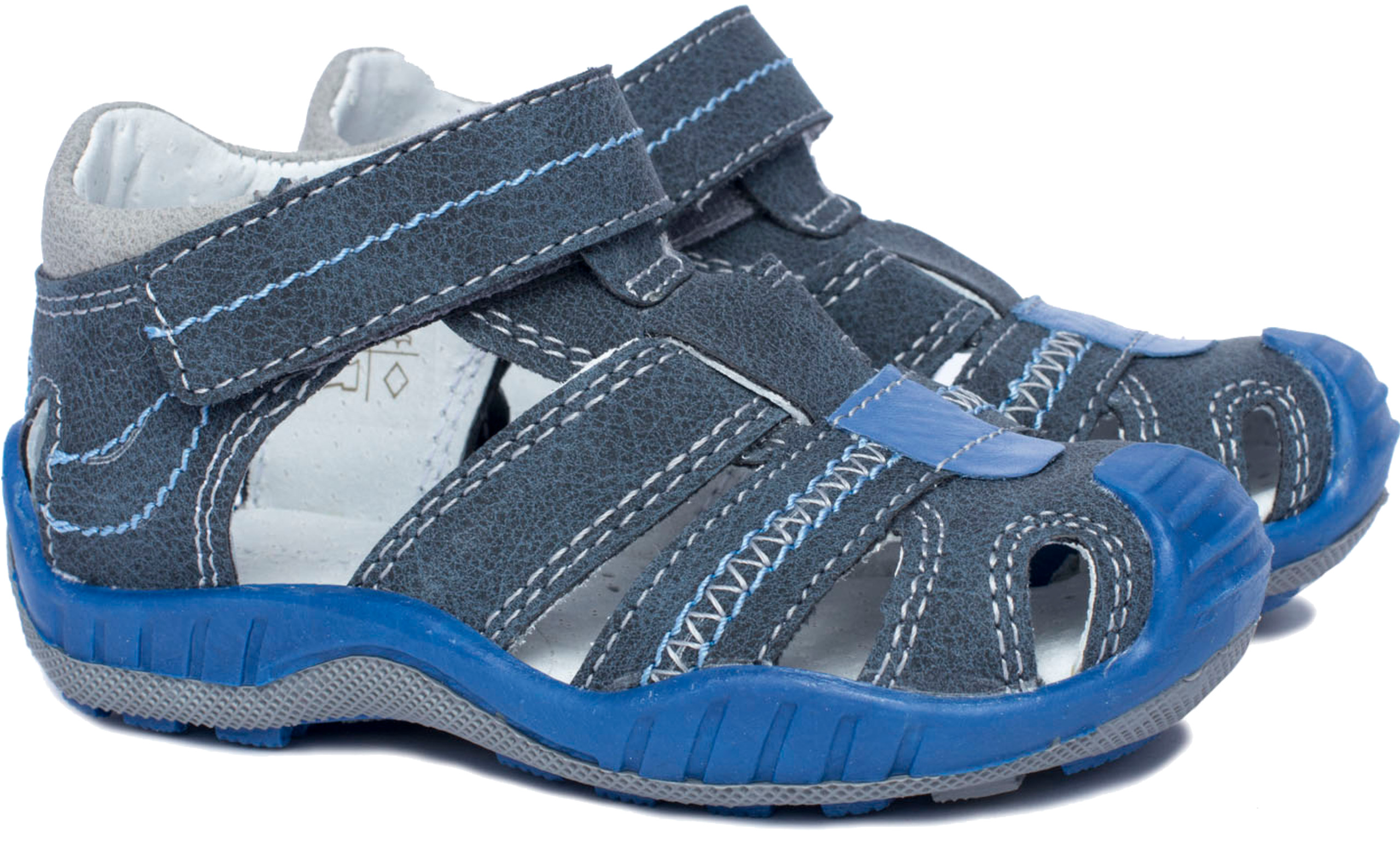 Kryté letní sandálky, barva modrá v kombinaci se šedou, zapínání na jeden suchý zip, svrchní materiál syntetika, uvnitř kůže včetně zdravotní kožené stélky. Špice chráněna proti okopu.
