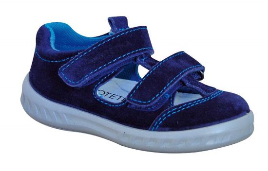 Letní sandálky, barva tmavě modrá v kombinaci s tyrkysově modrou, svrchní materiál kůže, uvnitř textil, kožená zdravotní stélka s podporou klenby, zapínání na dva suché zipy, pevná pata, ohebná podrážka.