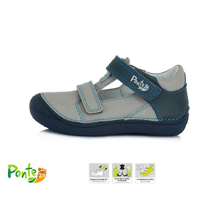 Celokožené polosandálky, barva béžová v kombinaci s tmavě modrou, zapínání na dva suché zipy, vytahovací kožená stélka, ohebná podrážka, pevná pata. Reflexní prvky.