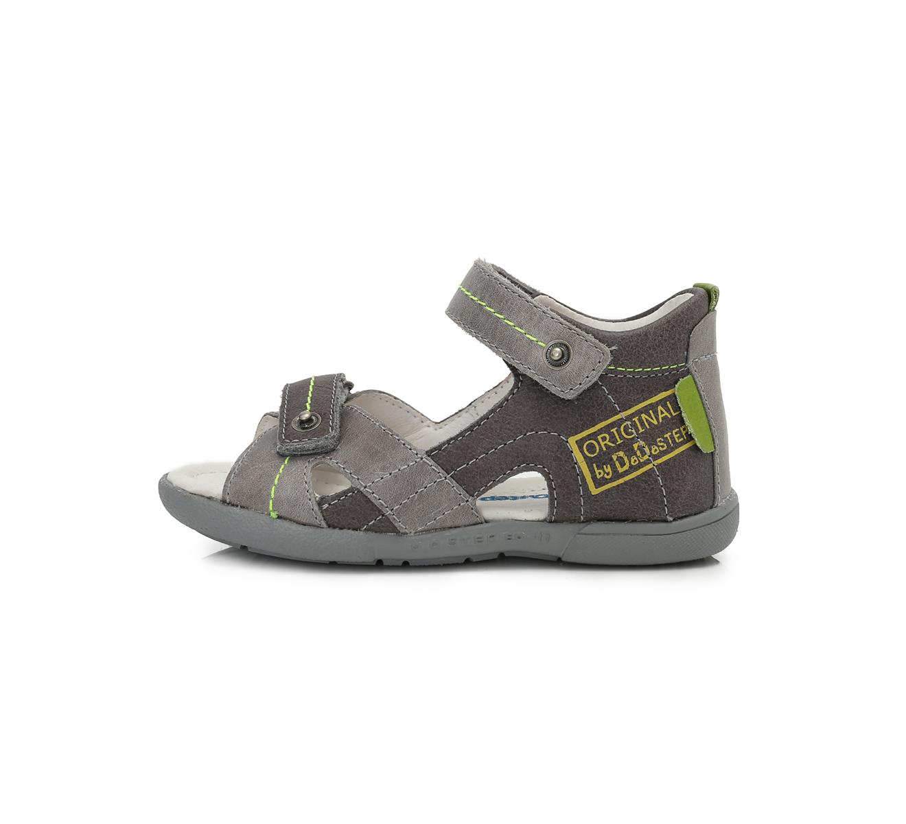 Letní sandálky, barva šedá v kombinaci se zelenou a žlutou, zapínání na dva suché zipy, pevná plná pata, svrchní materiál kůže, uvnitř kůže, kožená stélka s podporou klenby. Ohebná podrážka.