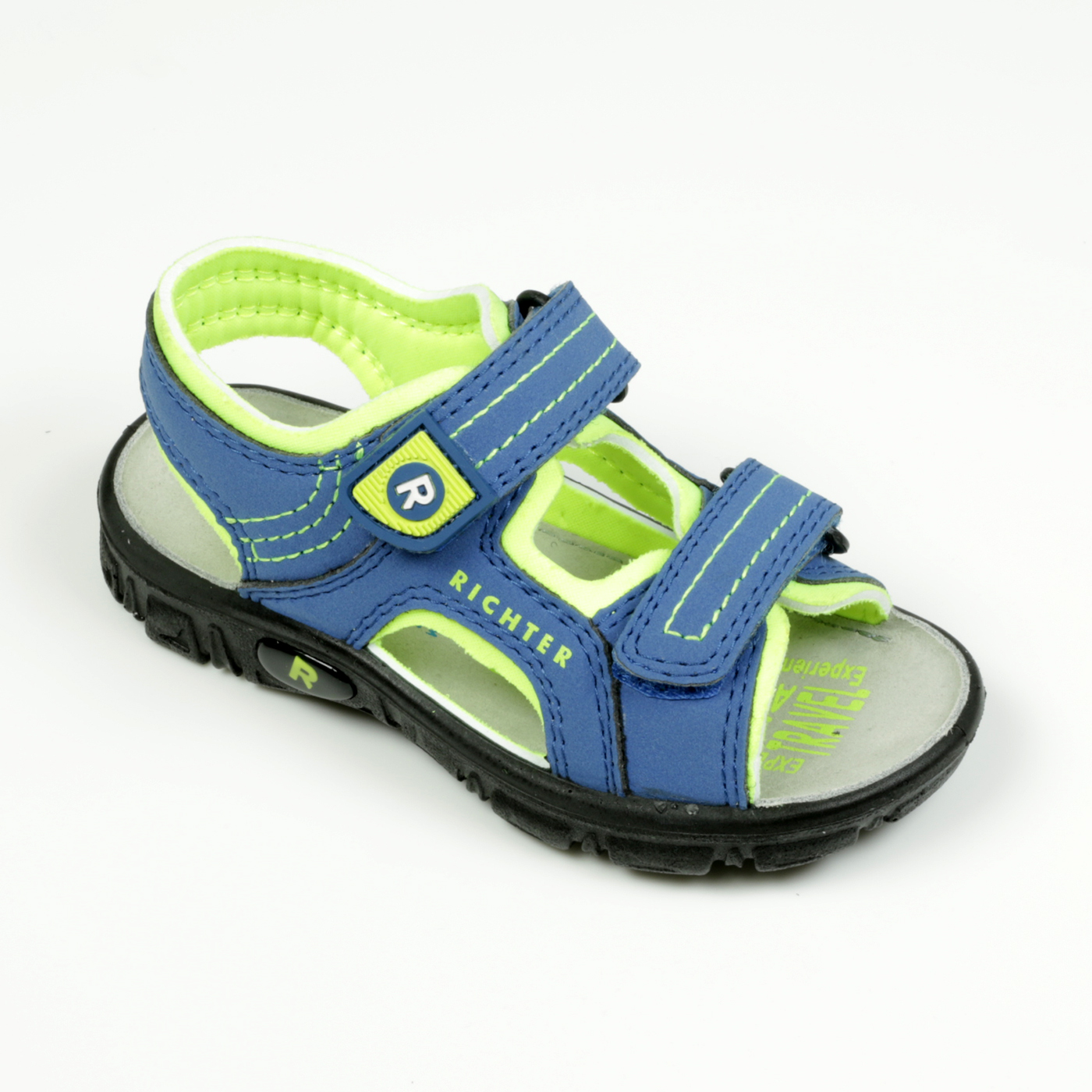Lehoučké letní sandálky, barva modrá v kombinaci s reflexní zelenou, svrchní materiál syntetika imitující kožený vzhled a textil, uvnitř textil, kožená stélka, zapínání na dva suché zipy.