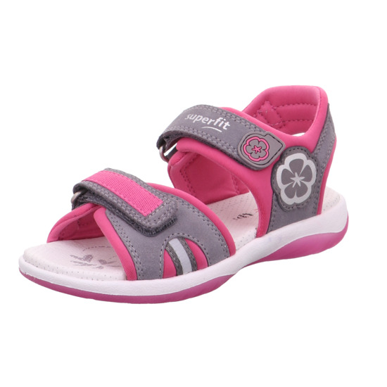 Letní sandálky, barva šedá v kombinaci s růžovou a stříbrnou, aplikace kytičky, zapínání na dva suché zipy, volná pata, anatomicky tvarovaná zdravotní kožená stélka. Materiál kůže a textil.