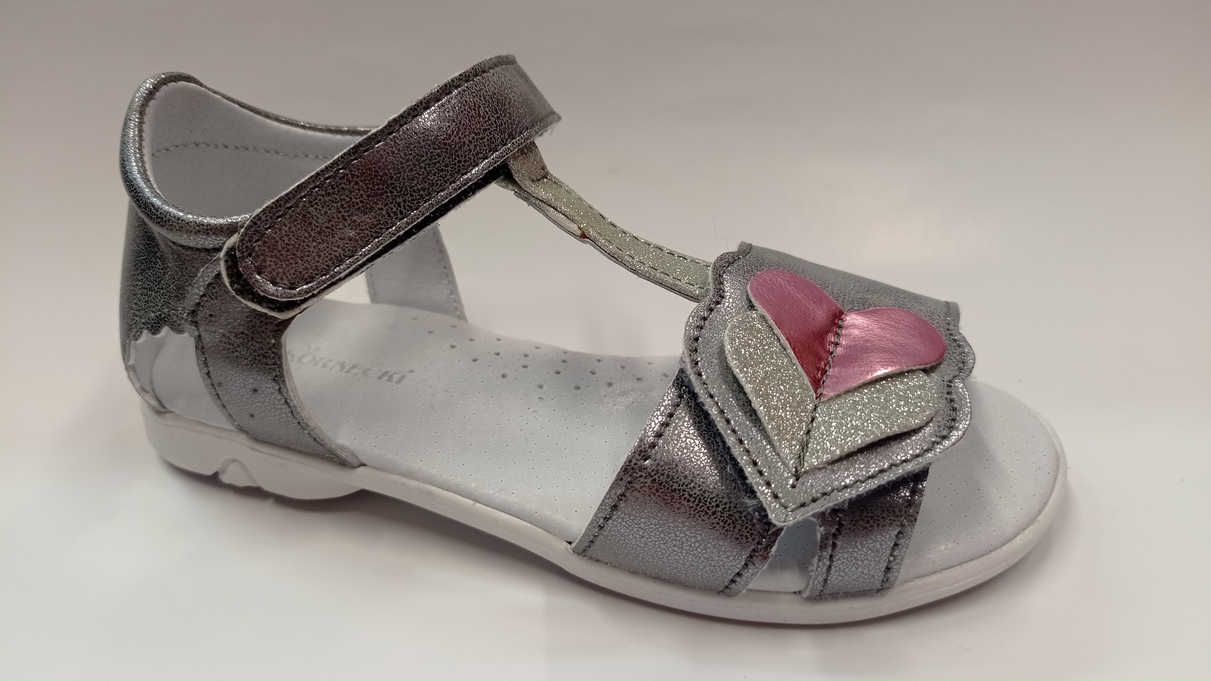 Letní sandálky, barva stříbřitě šedá v kombinaci s růžovou, pevná pata, aplikace srdíček, zapínání na dva suché zipy, svrchní materiál syntetika, uvnitř kožené, kožená stélka s podporou pro klenbu.