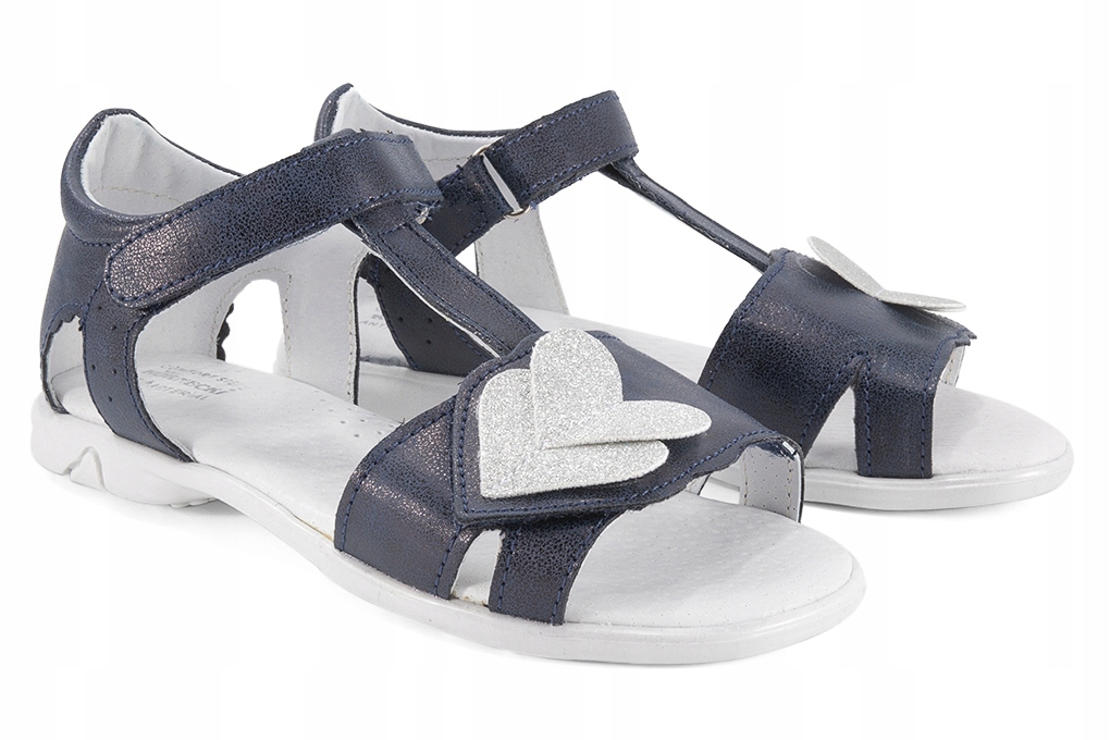 Letní sandálky, barva tmavě modrá v kombinaci se stříbrnou, pevná pata, aplikace srdíček, zapínání na dva suché zipy, svrchní materiál syntetika, uvnitř kožené, kožená stélka s podporou pro klenbu.