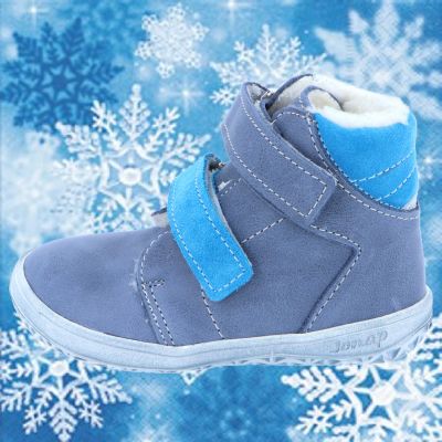 Zimní BAREFOOT boty, barva modrá v kombinaci s tyrkysovou, svrchní materiál kůže, uvnitř kožíšek, zapínání na dva suché zipy, vyjímatelná stélka. Ohebná podrážka, reflexní prvky.
