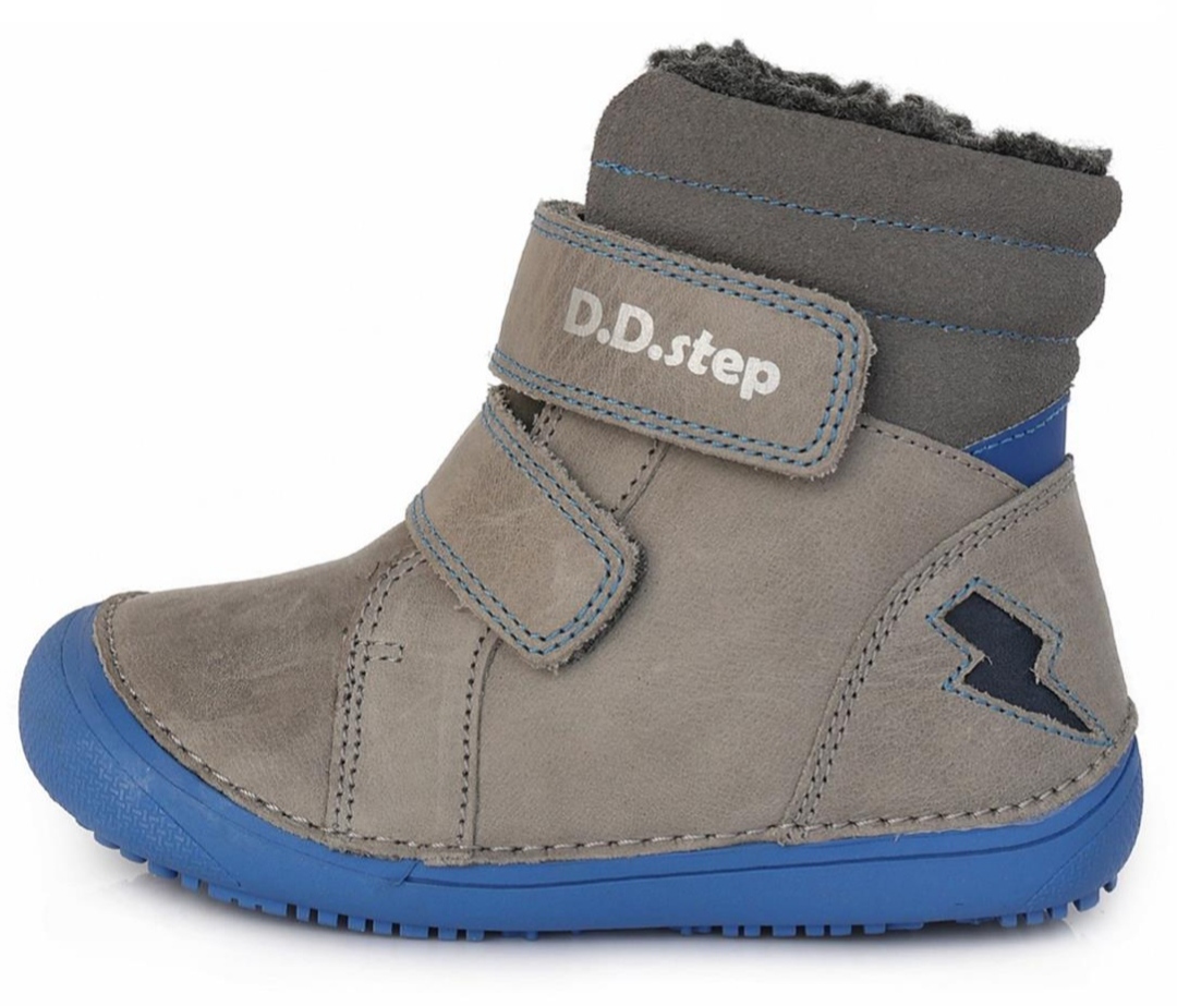 Zimní BAREFOOT boty, barva šedá v kombinaci s modrou, zapínání na dva suché zipy, svrchní materiál kůže, uvnitř kožíšek, vytahovací zateplená stélka, ohebná podrážka. Reflexní prvky.