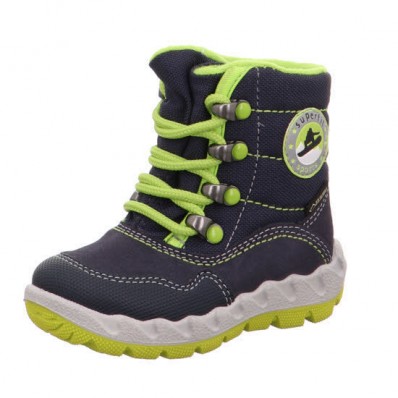 Krásné velice kvalitní zimní boty rakouské značky Superfit, barva tmavě modrá v kombinaci se zelenou, aplikace snowboardisty, šněrování, jazyk se u této boty dá krásně roztáhnout, takže se bez problému obouvají. Uvnitř boty je velice hřejivý kožíšek. GORE-TEX zabezpečuje optimální prodyšnost a tím vynikající klima uvnitř boty, ve kterém zůstanou dětské nohy v suchu a teple. Svrchní materiál kůže a tvrzený textil. Protiskluzová podrážka.