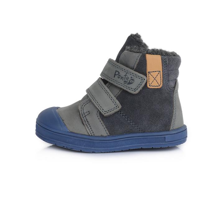 Zimní boty, barva šedá, zapínání na dva suché zipy, svrchní materiál kůže, všitý jazyk, uvnitř kožíšek, vytahovací zateplená stélka, pevná pata, špice chráněna proti okopu.