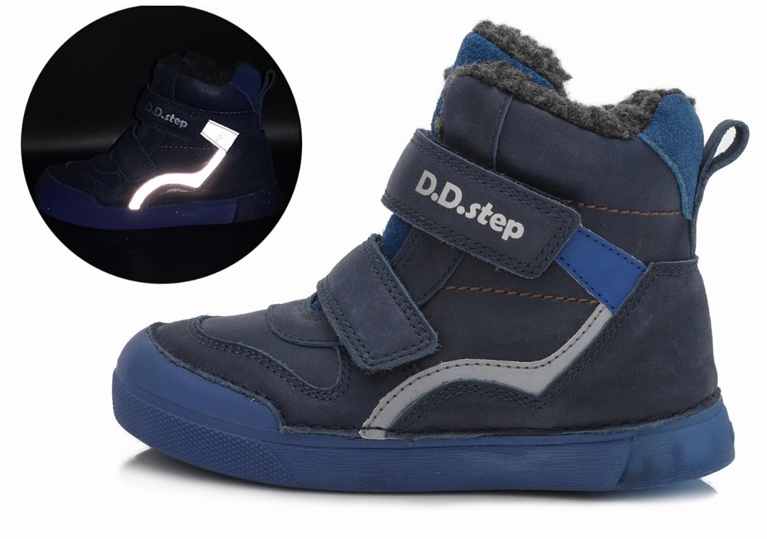 Zimní boty, barva modrá, zapínání na dva suché zipy, svrchní materiál kůže, uvnitř kožíšek, vytahovací zateplená stélka s podporou pro klenbu, ohebná podrážka, pevná pata. Reflexní prvky.