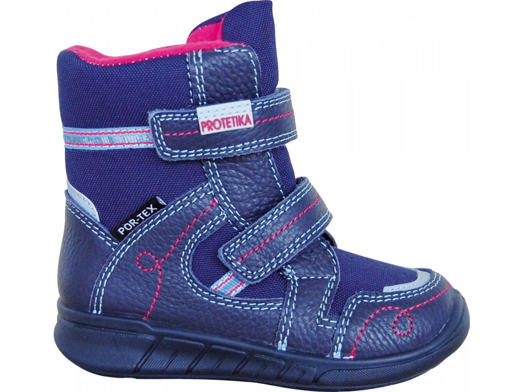 Tvar obuvi podporuje správný vývoj chodidla Vašeho dítěte. Použité atestované přírodní materiály zabezpečují zdravotní nezávadnost obuvi. Zimní boty s membránou PRO-tex, barva modrá v kombinaci se světle modrou a malinovou, svrchní materiál kůže a tvrzený textil, zapínání na dva suché zipy, všitý jazyk, uvnitř teplý kožíšek, zateplená vytahovací flísová stélka s podporou pro klenbu. Pevná pata. Ohebná podrážka, reflexní prvky.