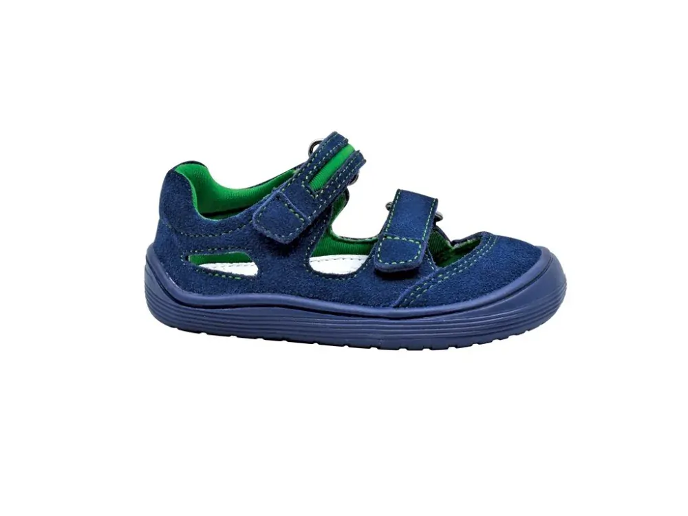 Celokožené barefoot sandálky, barva tmavě modrá v kombinaci se zelenou, zapínání na dva suché zipy, kožená vytahovací stélka, uvnitř textil.