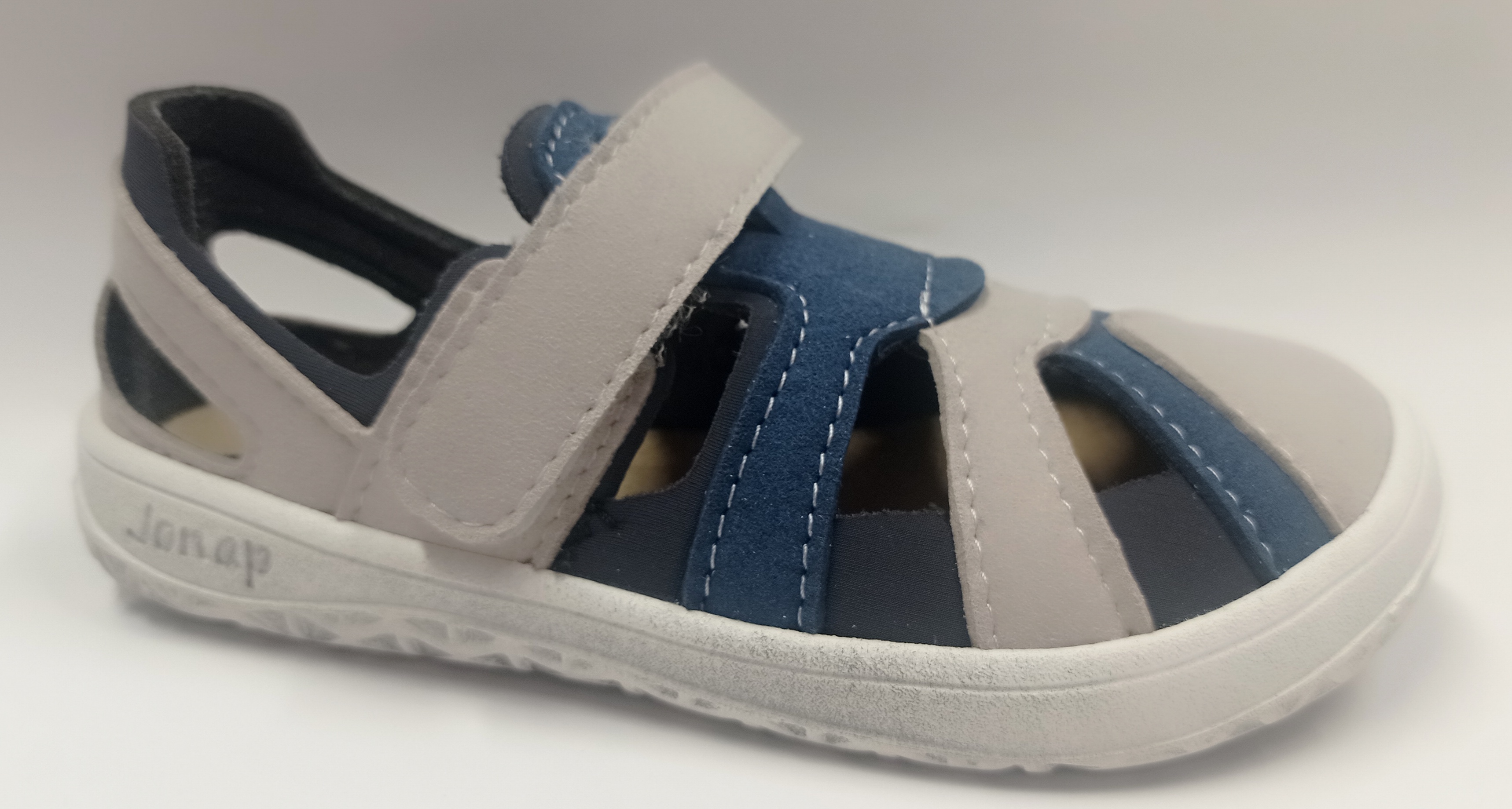 Letní BAREFOOT sandálky, barva modrá v kombinaci se světle šedou, svrchní materiál microfiber, uvnitř neopren, vytahovací textilní stélka. Zapínání na jeden suchý zip. Ohebná podrážka. Tato obuv splňuje všechny znaky barefoot obuvi. Jde o odlehčenou obuv, která simuluje cvičení, a proto je vhodná pouze na časově omezenou dobu. Doporučuje se v nerovném terénu, jako je zahrada, písečný a kamenitý povrch a podobně.