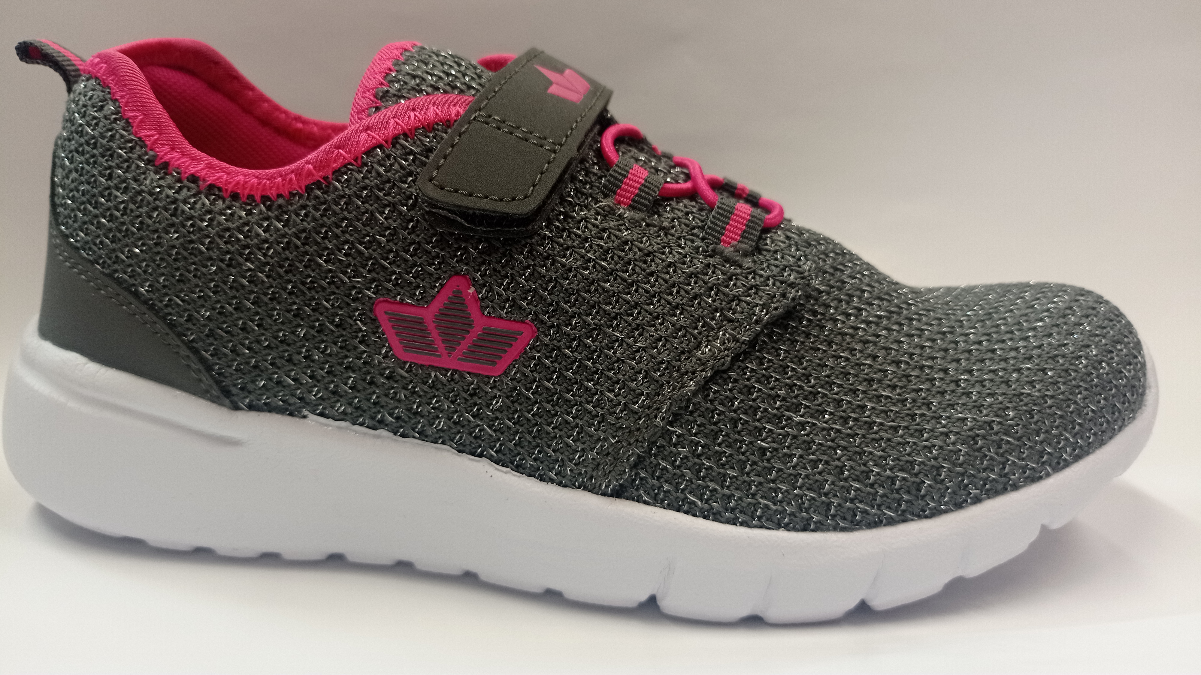 Odlehčené botasky, barva stříbřotě šedá v kombinaci s malinovou, falešné šněrování, zapínání na jeden suchý zip, svrchní materiál textil a syntetika, uvnitř textil, vytahovací stélka.