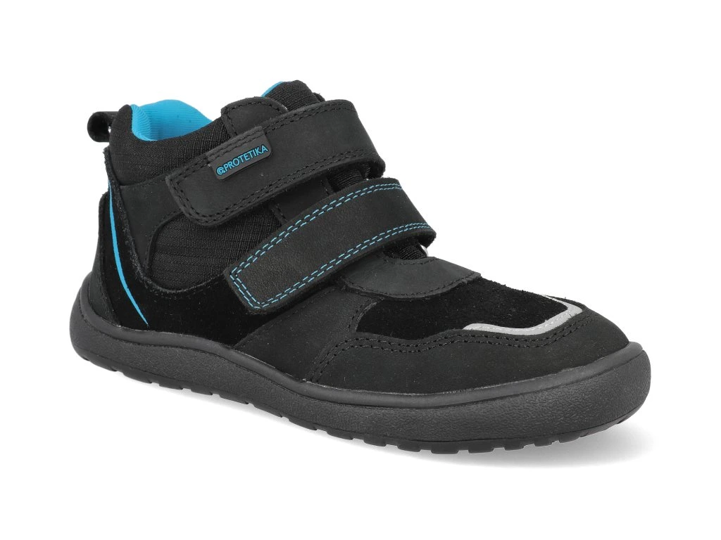 Celoroční BAREFOOT boty, membrána PRO-TEX, všitý jazyk, barva černá v kombinaci s tyrkysovou, svrchní materiál kůže, uvnitř textil, kožená vytahovací stélka, zapínanání na dva suché zipy. Ohebná podrážka. Reflexní prvky.