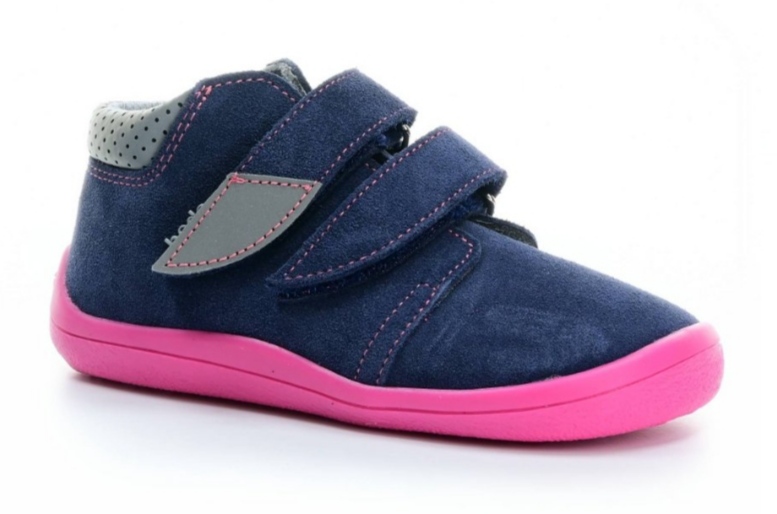 Celoroční kotníčkové BAREFOOT boty s membránou TE-POR, barva tmavě modrá, svrchní materiál kůže, uvnitř textil, zapínání na dva suché zipy, široká špice, ohebná flexibilní podrážka, pevnější opatek, vytahovací stélka, reflexní prvky.
