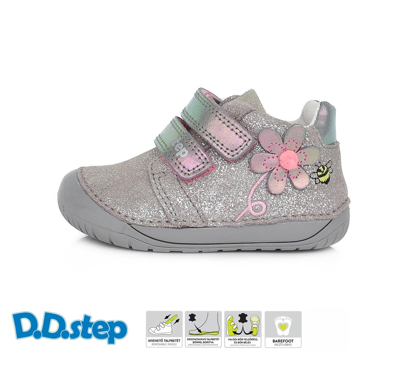 Celokožené BAREFOOT boty, zapínání na dva suché zipy, barva stříbrná v kombinaci s růžovou, aplikace kytičky a včely, vytahovací stélka, ohebná podrážka. Reflexní prvky.Stélka: 20-125 mm, 21-130 mm, 22-140 mm, 23-145 mm, 24-150 mm, 25-160 mm celý popis