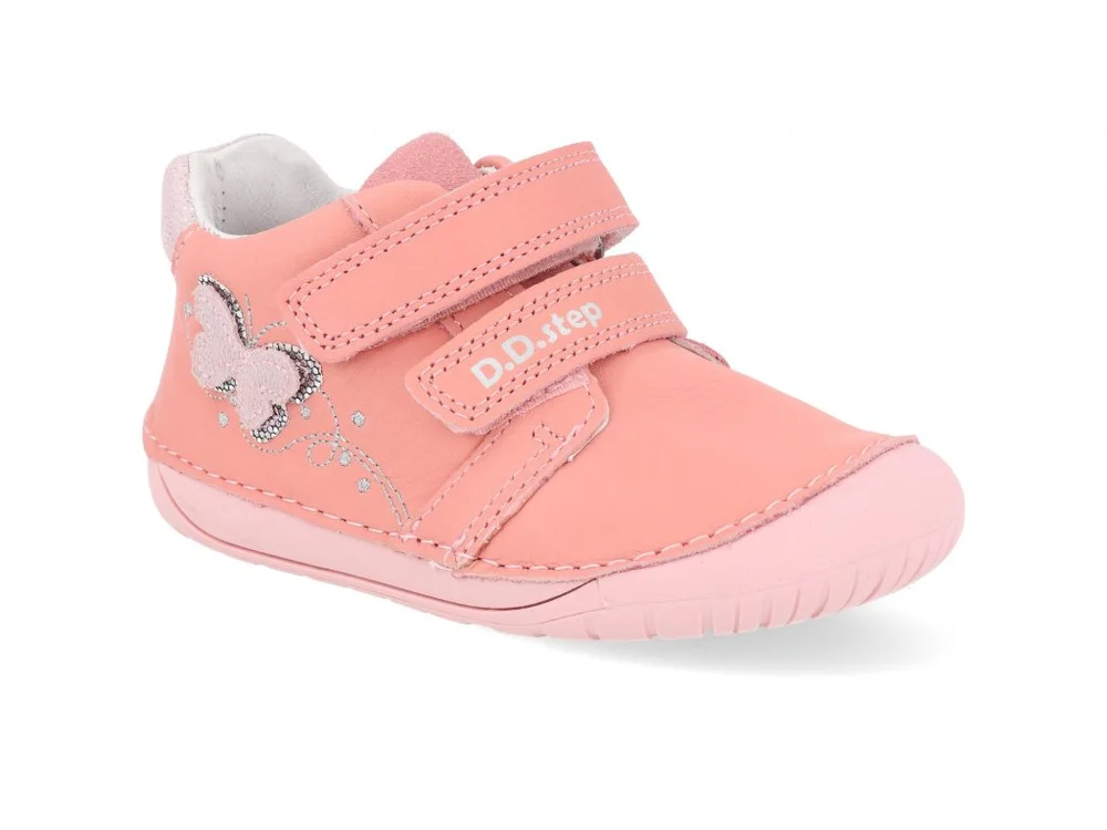 Celokožené BAREFOOT boty, zapínání na dva suché zipy, barva lososová v kombinaci se stříbrnou, aplikace motýlka, vytahovací stélka. Ohebná podrážka. Stélka: 20-125 mm, 21-130 mm, 22-140 mm, 23-145 mm, 24-150 mm, 25-160 mm celý popis