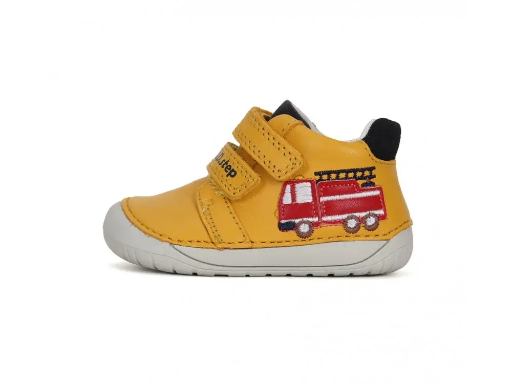Celokožené BAREFOOT boty, zapínání na dva suché zipy, barva žlutá v kombinaci s tmavě modrou, aplikace hasičského auta, vytahovací stélka. Ohebná podrážka.