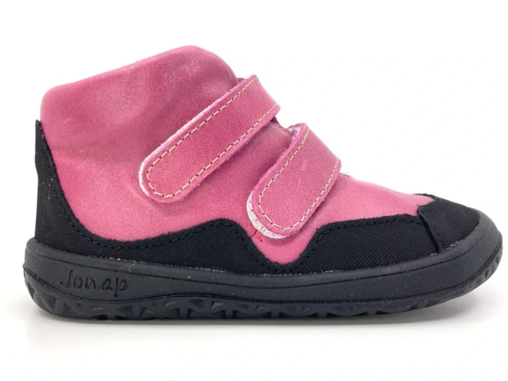 Celoroční BAREFOOT kotníčkové kožené boty, barva růžová v kombinaci s černou, zapínání na dva suché zipy, široká a vyjímatelná textilní stélka, uvnitř textil, který brání proti chladu. Tato obuv splňuje všechny znaky barefoot obuvi. Jde o odlehčenou obuv, která simuluje cvičení, a proto je vhodná pouze na časově omezenou dobu. Doporučuje se v nerovném terénu, jako je zahrada, písečný a kamenitý povrch a podobně.