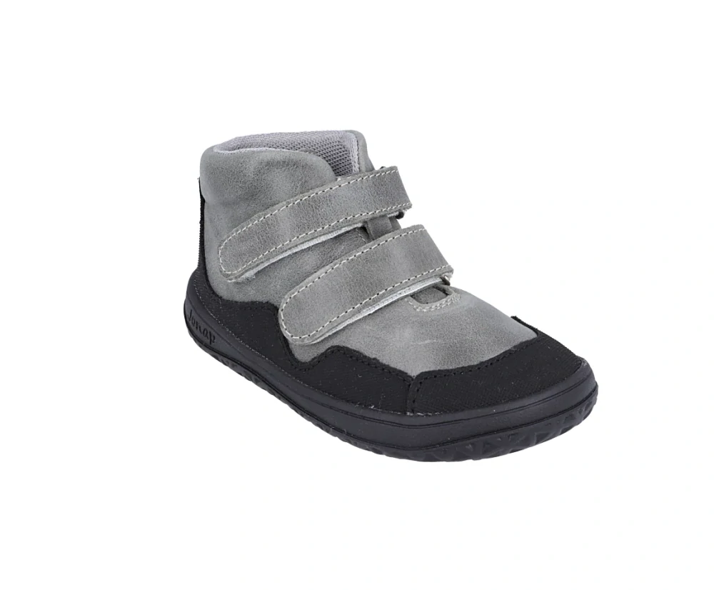 Celoroční BAREFOOT kotníčkové kožené boty, barva šedá v kombinaci s černou, zapínání na dva suché zipy, široká a vyjímatelná textilní stélka, uvnitř textil, který brání proti chladu. Tato obuv splňuje všechny znaky barefoot obuvi. Jde o odlehčenou obuv, která simuluje cvičení, a proto je vhodná pouze na časově omezenou dobu. Doporučuje se v nerovném terénu, jako je zahrada, písečný a kamenitý povrch a podobně.