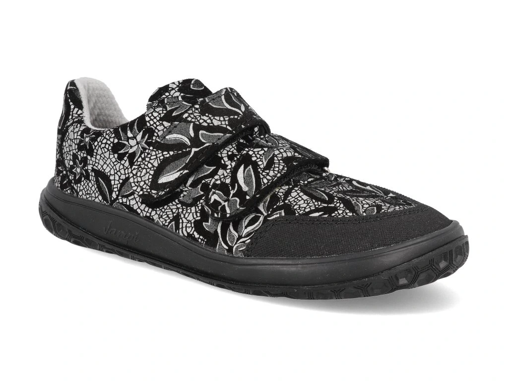 Celoroční BAREFOOT kožené boty, barva černá v kombinaci se stříbrnou, potisk kytiček, zapínání na dva suché zipy, široká a vyjímatelná textilní stélka, uvnitř textil, který brání proti chladu. Tato obuv splňuje všechny znaky barefoot obuvi. Jde o odlehčenou obuv, která simuluje cvičení, a proto je vhodná pouze na časově omezenou dobu. Doporučuje se v nerovném terénu, jako je zahrada, písečný a kamenitý povrch a podobně. Špice chráněna proti okopu.