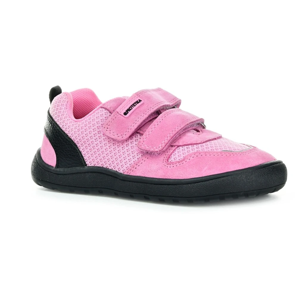 Celoroční barefoot boty, barva růžová v kombinaci s černou, svrchní materiál kůže a textil, uvnitř textil, kožená vytahovací stélka, ohebná podrážka. Široká kulatá špice. Reflexní prvky.