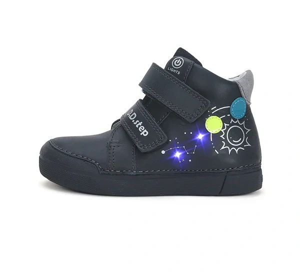 Celoroční celokožené kotníčkové boty, při chůzi blikají, blikání se dá vypínat, barva tmavě modrá, obrázek sluneční soustavy, zapínání na dva suché zipy, vytahovací stélka s podporou pro klenbu, reflexní prvky.