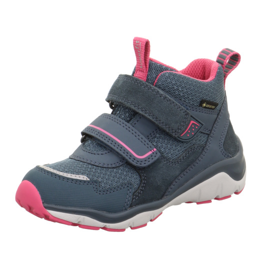 Celoroční goretexová obuv značky Superfit. Tento model je kotníčkový. Barva modrá v kombinaci s malinovou. Svršek je vyroben z pravé nubukové kůže, textilu a syntetiky. Uvnitř je flís a textil. Stélka je flísová vytahovací. Díky membráně Goretex je tato bota vodotěsná a odolná proti větru a prodyšná. Podrážka je vyrobena z pryže. Dva suché zipy přes nárt umožňují snadný vstup do boty. Je extrémně lehká s maximálně ohebnou podešví, pevným opatkem a kvalitní stélkou. Chráněná špička proti okopu. Reflexní prvky.