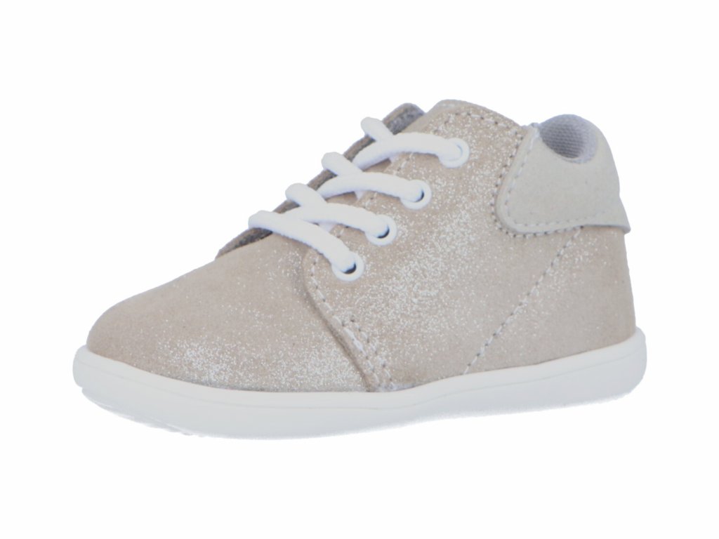 Celoroční kotníčkové boty, barva béžová, stříbřitý efekt, šněrování, svrchní materiál kůže, uvnitř textil, textilní vytahovací stélka s podporou pro klenbu, ohebná podrážka, pevná pata.