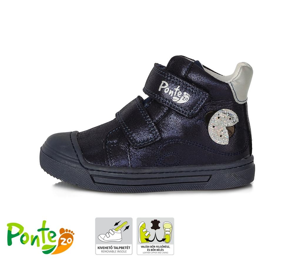 Celokožené kotníčkové boty na dva suché zipy, barva tmavě perleťově modrá v kombinaci se stříbrnou, aplikace berušky, ohebná podrážka, kožená vytahovací stélka, pevná pata. Špice chráněna proti okopu. Reflexní prvky.Stélka: 22-135 mm, 23-140 mm, 24-145 mm, 25-160 mm, 26-165 mm, 27-170 mm celý popis