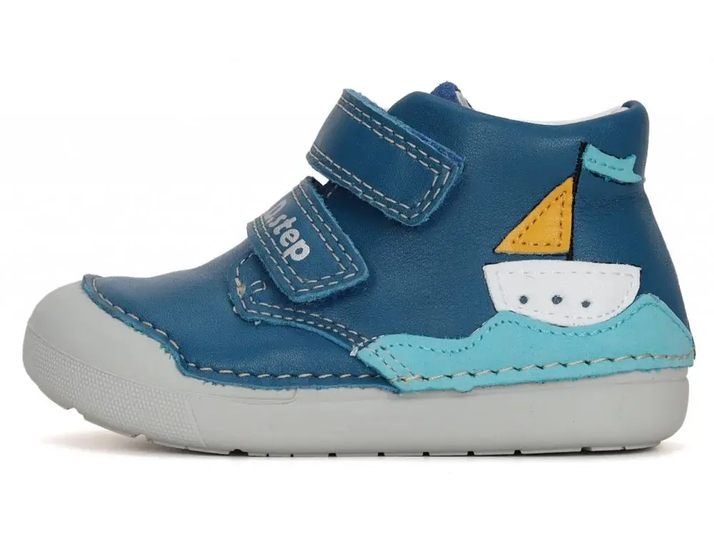 Celokožené kotníčkové boty, zapínání na dva suché zipy, barva modrá v kombinaci s tyrkysovou, bílou a žlutou, aplikace loďky, vytahovací stélka s podporou pro klenbu, pevná pata, ohebná podrážka.