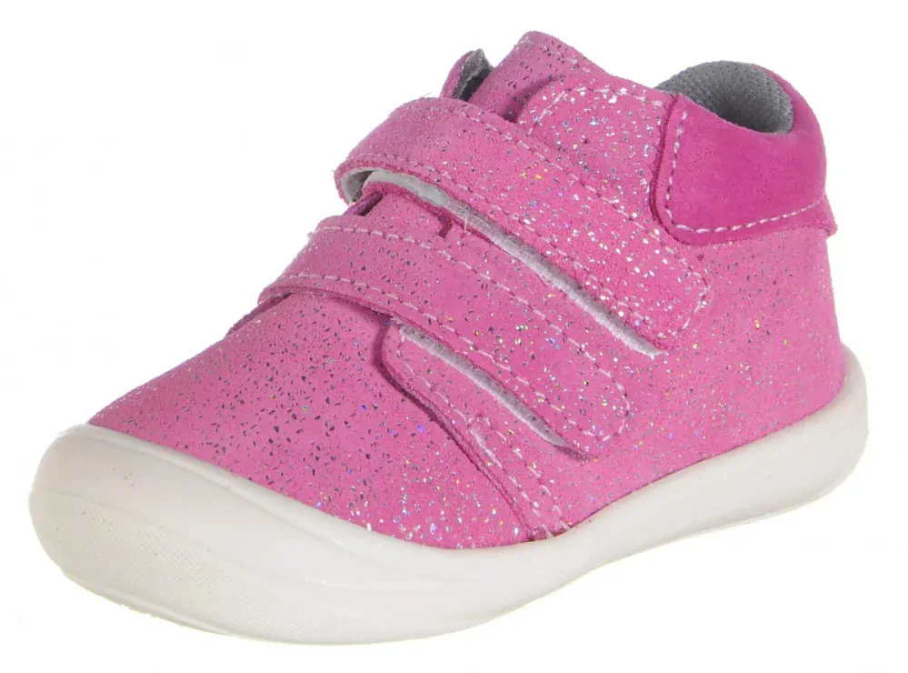 Celoroční kotníčkové boty, barva růžová, stříbřitý potisk, zapínání na dva suché zipy, svrchní materiál kůže, uvnitř textil, textilní vytahovací stélka s podporou pro klenbu, ohebná podrážka, pevná pata.
