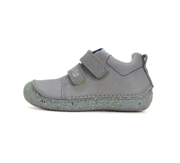 Celokožené boty na dva suché zipy, barva šedá v kombinaci s modrou, ohebná podrážka, kožená vytahovací stélka, pevná pata. Reflexní prvky.