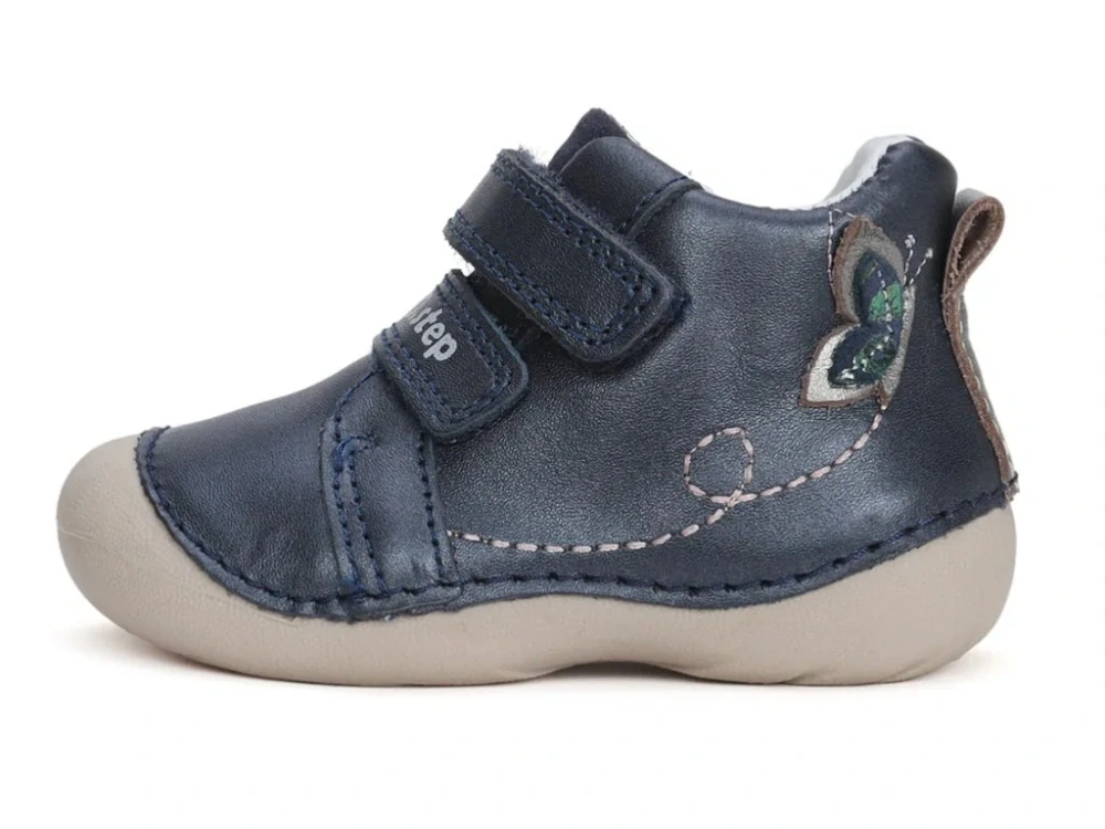 Celokožené kotníčkové boty, zapínání na dva suché zipy, barva stříbřitě modrá v kombinaci se zlatou, aplikace motýlka, vytahovací stélka s podporou pro klenbu, pevná pata, ohebná podrážka.