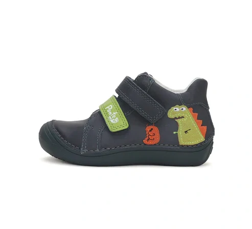 Celokožené boty na dva suché zipy, barva tmavě modrá v kombinaci se zelenou a oranžovou, aplikace dinosaura, ohebná podrážka, kožená vytahovací stélka, pevná pata. Reflexní prvky.