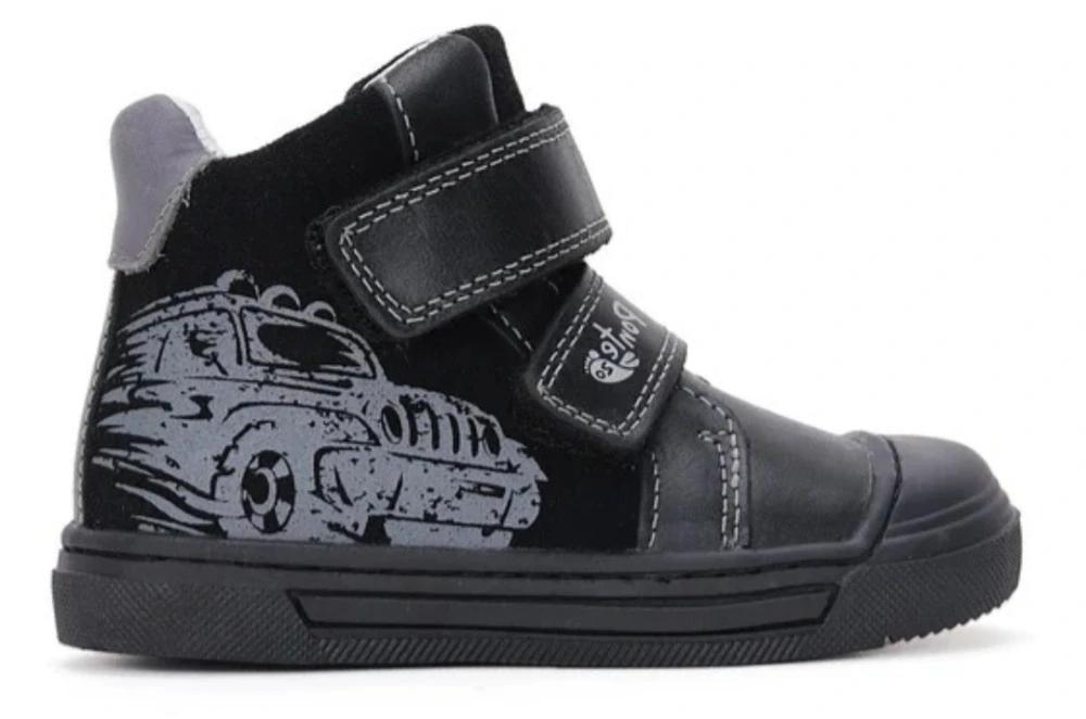 Celokožené kotníčkové boty na dva suché zipy, barva černá v kombinaci se šedou, potisk auta, ohebná podrážka, kožená vytahovací stélka, pevná pata. Reflexní prvky.Stélka: 28-180 mm, 29-185 mm, 30-190 mm celý popis