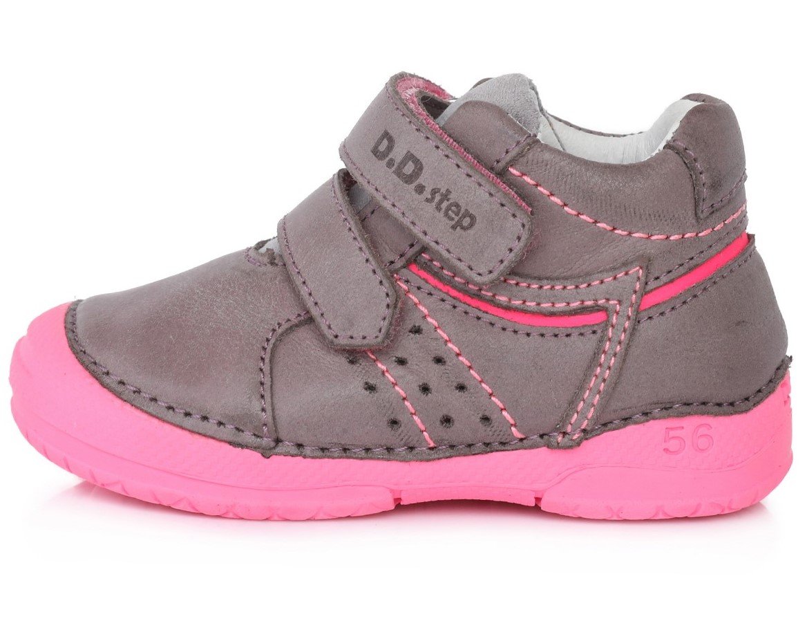 Celokožené kotníčkové boty, zapínání na dva suché zipy, barva šedohnědá v kombinaci s reflexní růžovou, vytahovací stélka s podporou pro klenbu. Reflexní prvky.