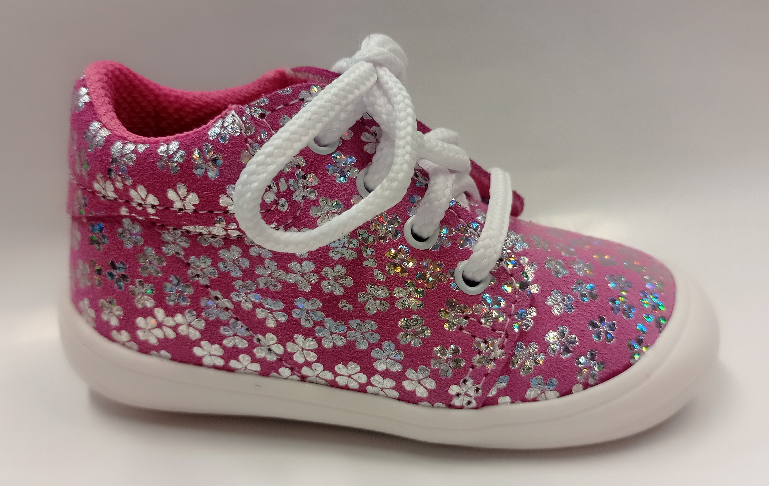 Celoroční kotníčkové boty, barva růžová v kombinaci se stříbrnou, potisk kytiček, šněrování, svrchní materiál kůže, uvnitř textil, textilní vytahovací stélka s podporou pro klenbu, ohebná podrážka, pevná pata.  Stélka: 18-110 mm, 19-120 mm, 20-125 mm, 21-135 mm, 22-140 mm celý popis