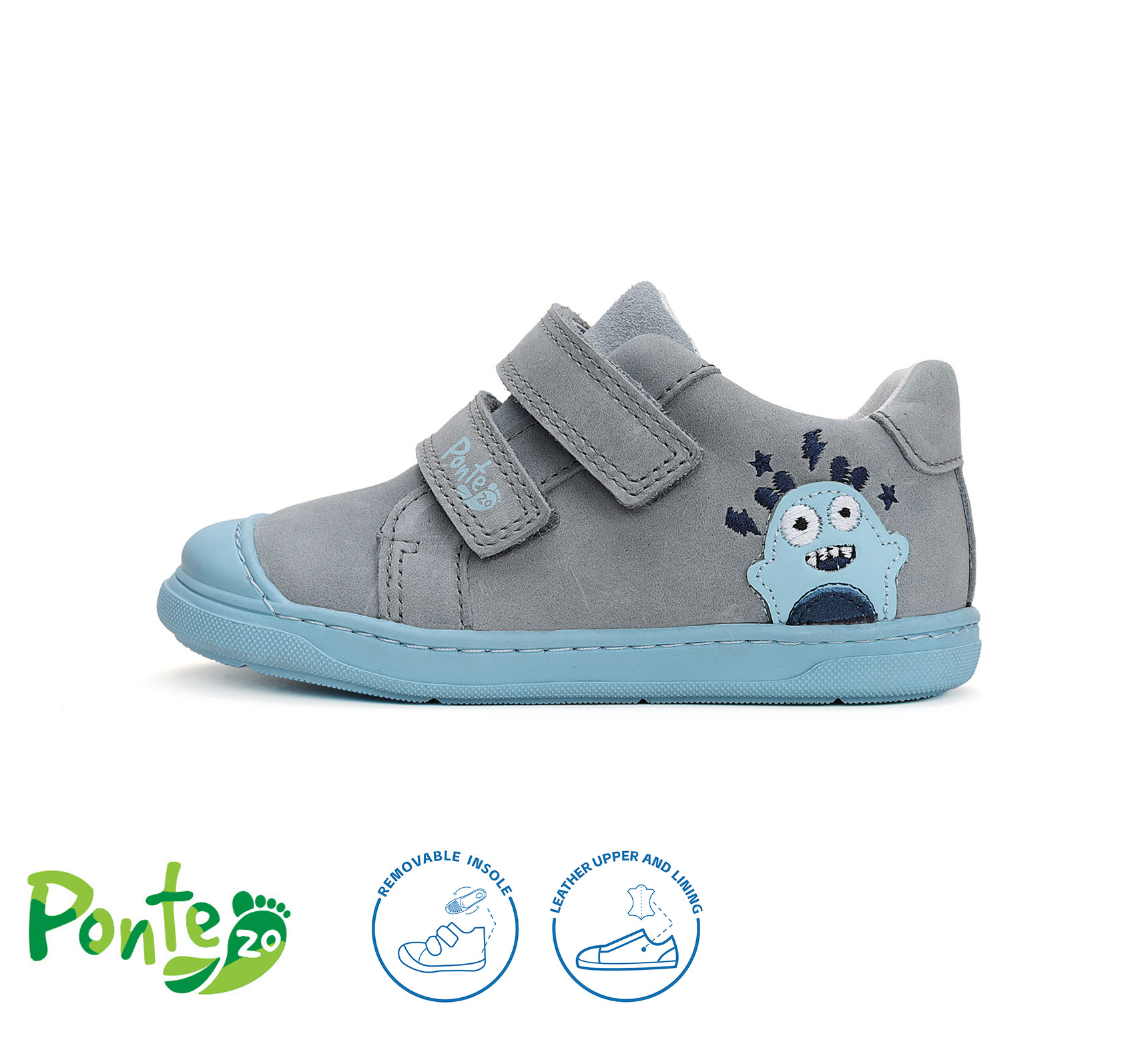Celokožené boty na dva suché zipy, barva světle šedá v kombinaci se světle modrou, aplikace příšerky, kožená vytahovací stélka s podporou pro klenbu, pevná pata. Špice chráněna proti okopu.