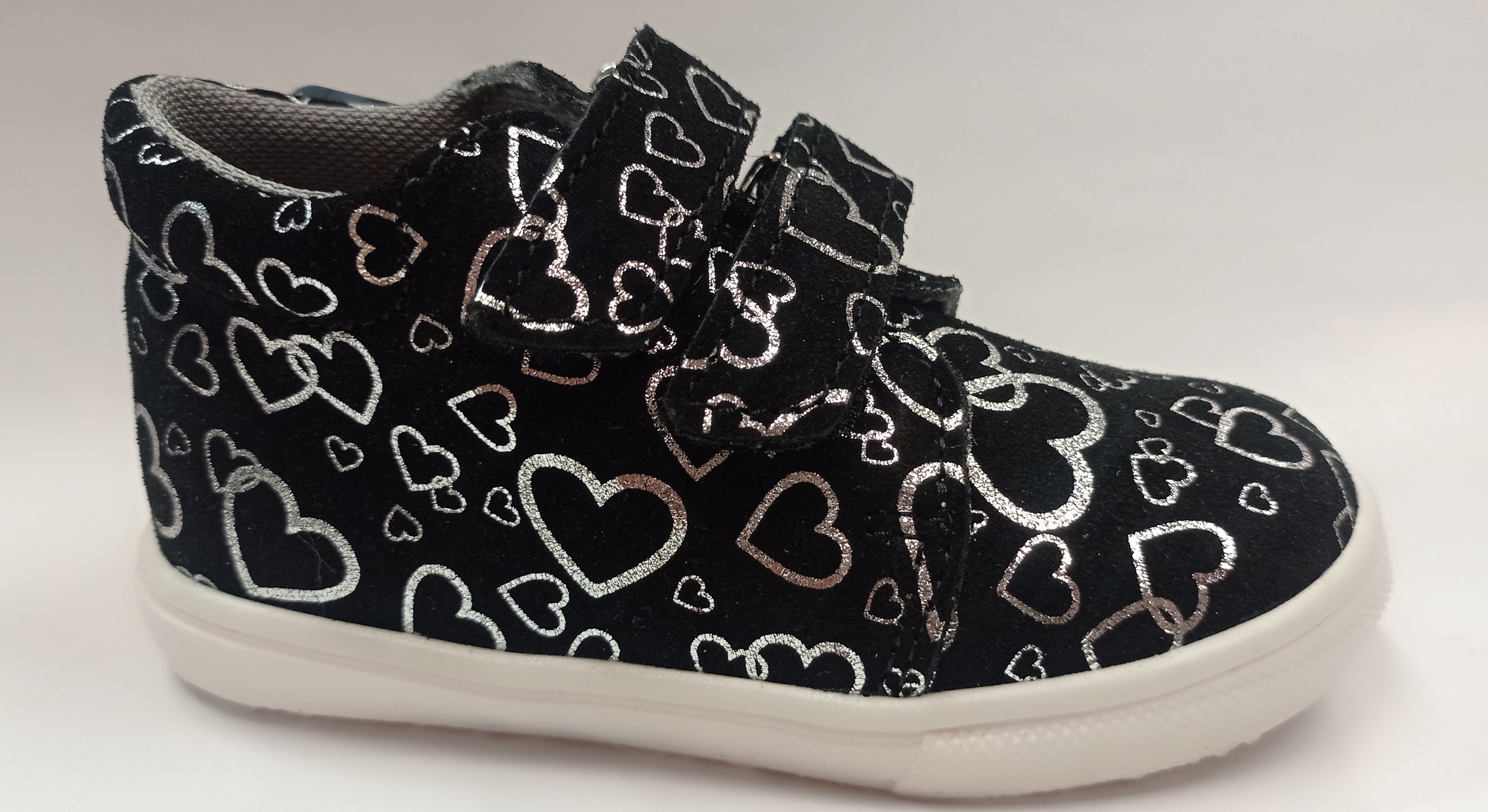 Celoroční kotníčkové boty, barva černá, potisk stříbrných srdíček, zapínání na dva suché zipy, svrchní materiál kůže, uvnitř textil, textilní vytahovací stélka s podporou pro klenbu, ohebná podrážka, pevná pata. Stélka: 20-130 mm, 21-135 mm, 22-145 mm, 23-150 mm, 24-155 mm, 25-165 mm, 26-170 mm, 27-... celý popis