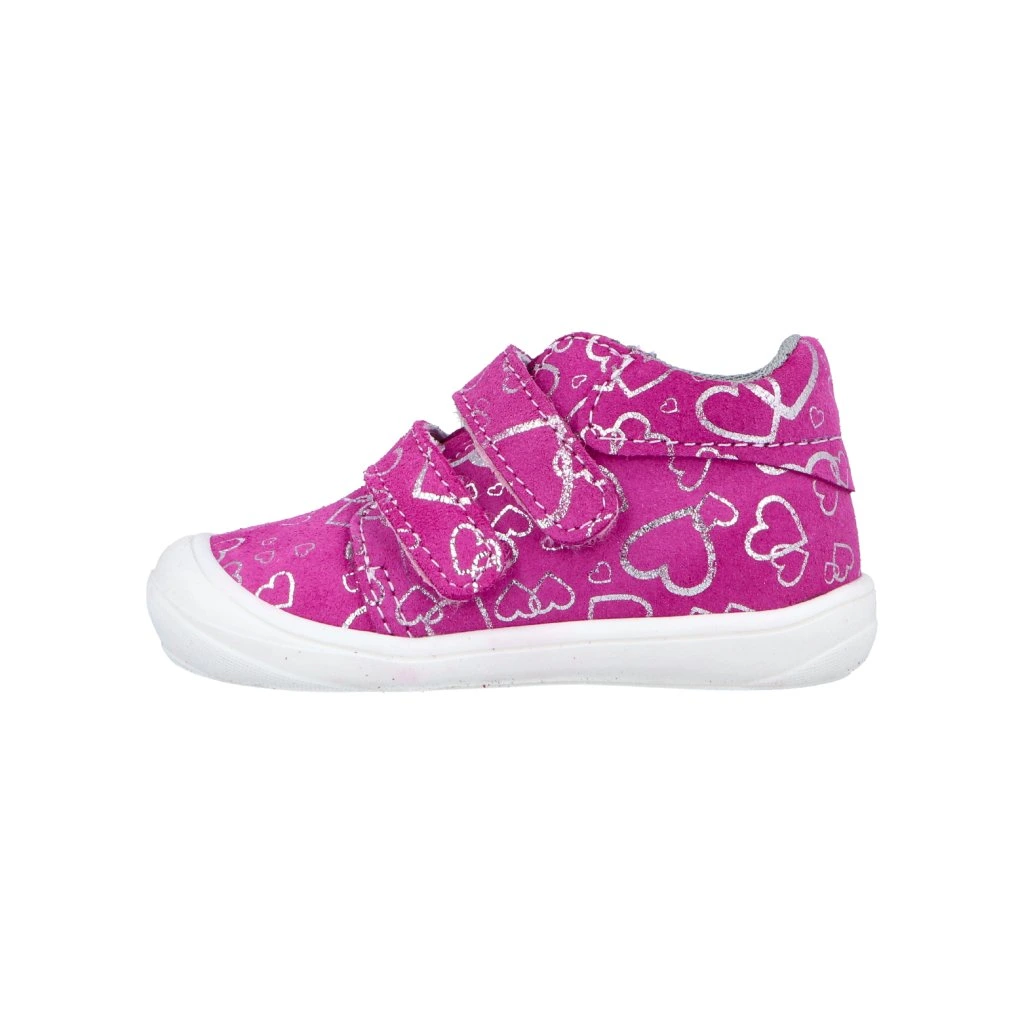 Celoroční kotníčkové boty, barva sytě růžová, potisk stříbrných srdíček, zapínání na dva suché zipy, svrchní materiál kůže, uvnitř textil, textilní vytahovací stélka s podporou pro klenbu, ohebná podrážka, pevná pata.  Stélka: 18-110 mm, 19-120 mm, 20-125 mm, 21-135 mm, 22-140 mm celý popis